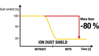 The ION DUST SHIELD was specially developed for cold milling machines. In addition to visible dust, a considerable amount of particulate matter is also produced when removing an asphalt surface. The ION DUST SHIELD binds the fine particulate matter by electrically charging the particles. The particles clump permanently to harmless coarse dust and can be easily removed. This leads to a reduction in particulate matter of over 80% - as confirmed by the IGF Institute for Hazardous Substances Research at the Ruhr University. Demonstrably cleaner air for personnel, residents and passers-by.