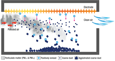 To the catalogueThe technology employed is a positive ionisation filter. The fine and medium-fine dust particles are charged positively while still on the conveyor belt in the cold milling machine and are subsequently attracted by a negatively charged ionisation filter. This process causes the particles to clump together to form visible coarse dust that is too large to penetrate into the lung tissue. It is simply removed together with the rest of the milled material.