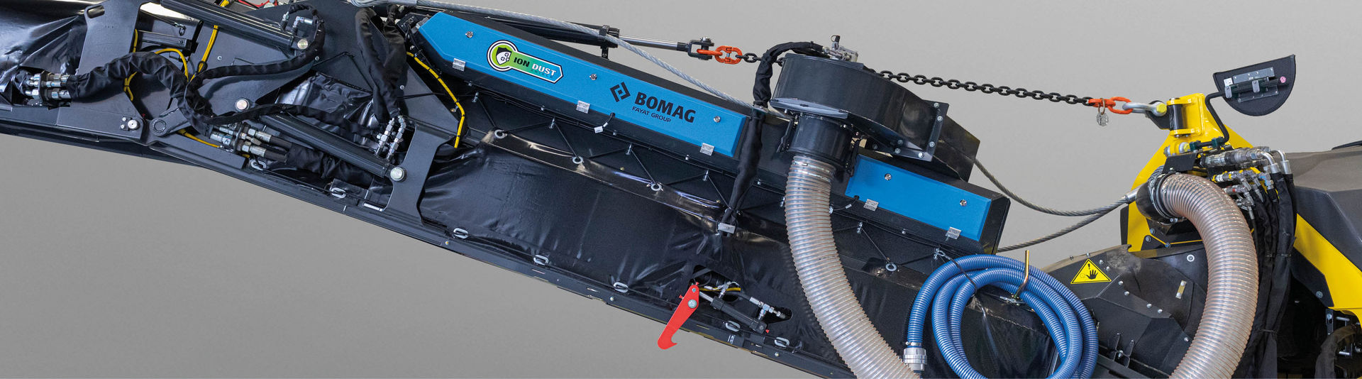 The ION DUST SHIELD received the silver medal in the category “Innovation Awards” at Bauma 2019. This innovation almost completely eliminates fine particulate matter by converting it into harmless coarse dust. A legally required extraction system, in contrast, does not remove the particulate matter, but merely transports it out of the direct vicinity of the operating personnel and releases it into the environment. BOMAG is the only manufacturer to offer this technology, which protects both the operator and the environment.
