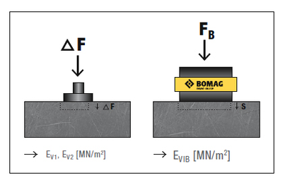 To the catalogueThe interaction of the acceleration of the vibrating drum and the stiffness of the soil are used in E-VIB. In general, soil stiffness will increase along side compaction. If the soil becomes stiffer, the drum acceleration will also increase. The measuring sensors record the acceleration. This data is used to determine the effective contact force between the soil and drum and, at the same time, the vibration path of the drum. If the contact force is then laid on top of the vibration path of the drum, this results in a loading and unloading curve for every revolution of the exciter. The E-VIB value corresponds with the increase in load curve, as this correlates with the stiffness of the soil. The measuring principle corresponds with the static plate test.