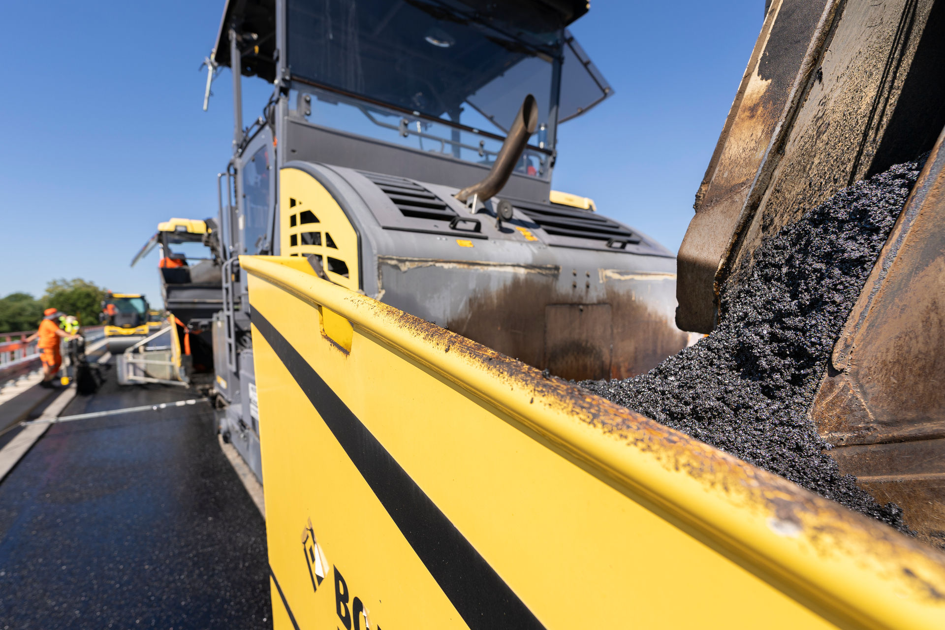 Auf der Baustelle sind gleich zwei BOMAG BMF 2500 S Asphaltbeschicker im Einsatz. Jeweils ausgestattet mit dem kurzen, 1,2 Meter breiten Förderband können sie in nur 35 Sekunden bis zu 27 Tonnen Asphalt an die Fertiger übergeben – so lassen sich Meter machen. Das kettenverstärkte Band sorgt dabei für ein zuverlässiges Beschicken ohne Ausfallzeiten. Zudem ist der Materialkübel der Beschicker mit einem Fassungsvermögen von über 15 Tonnen besonders großzügig dimensioniert. Das sorgt für kurze Lkw-Wechselzeiten.