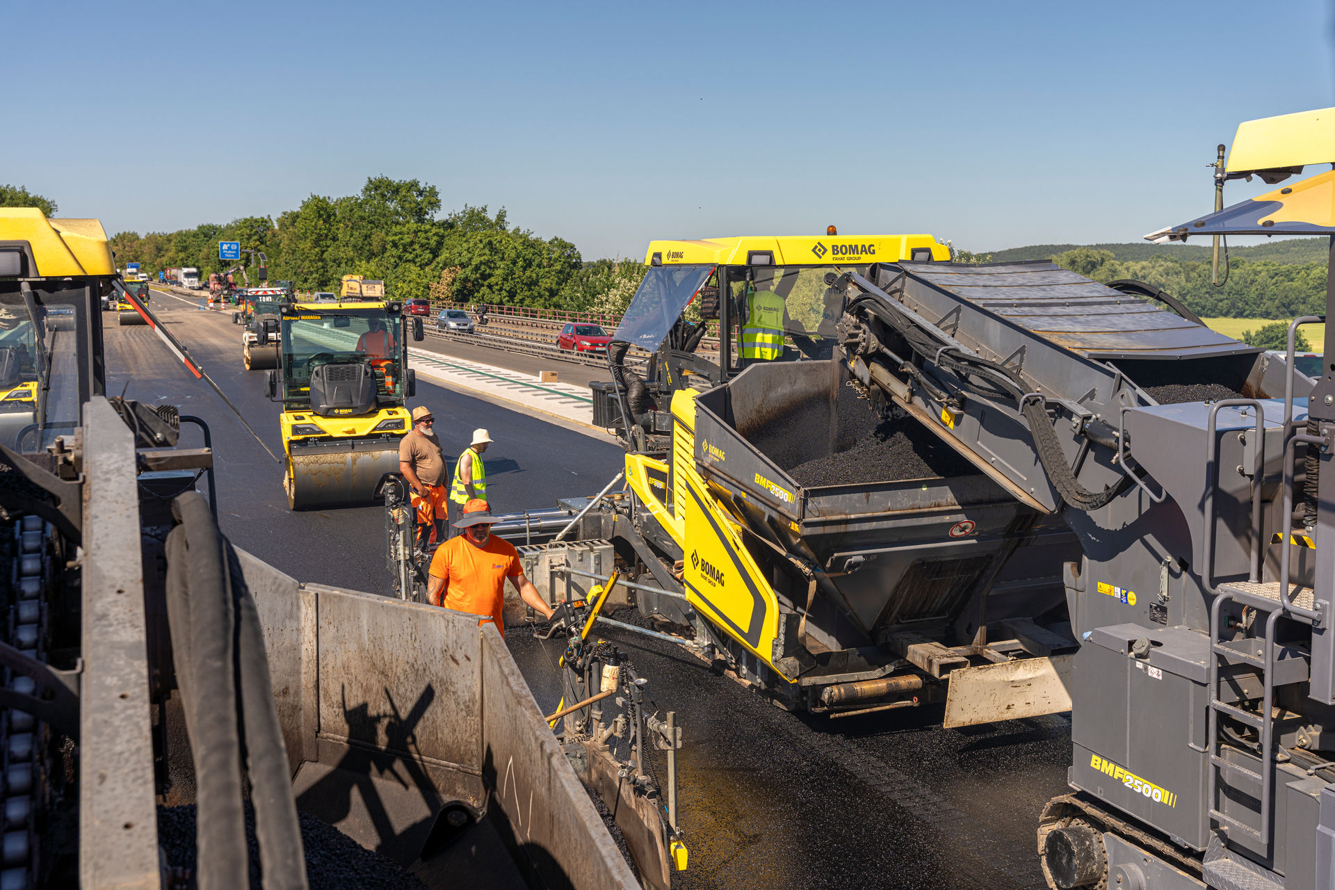 Das Mischgut wird von zwei BOMAG Großfertigern verarbeitet. Sie bilden das Herzstück der gelben Kolonne. Die Maschinen vom Typ BF 700 C-3 haben mit ihrem optimalen Verhältnis von Produktivität und Flexibilität alles, was man für einen qualitativ hochwertigen und zugleich effizienten Straßenbau braucht. Darüber hinaus bieten Sie – dank der perfekten Rundumsicht aus dem Fahrerstand – ein deutliches Plus an Sicherheit und Komfort.