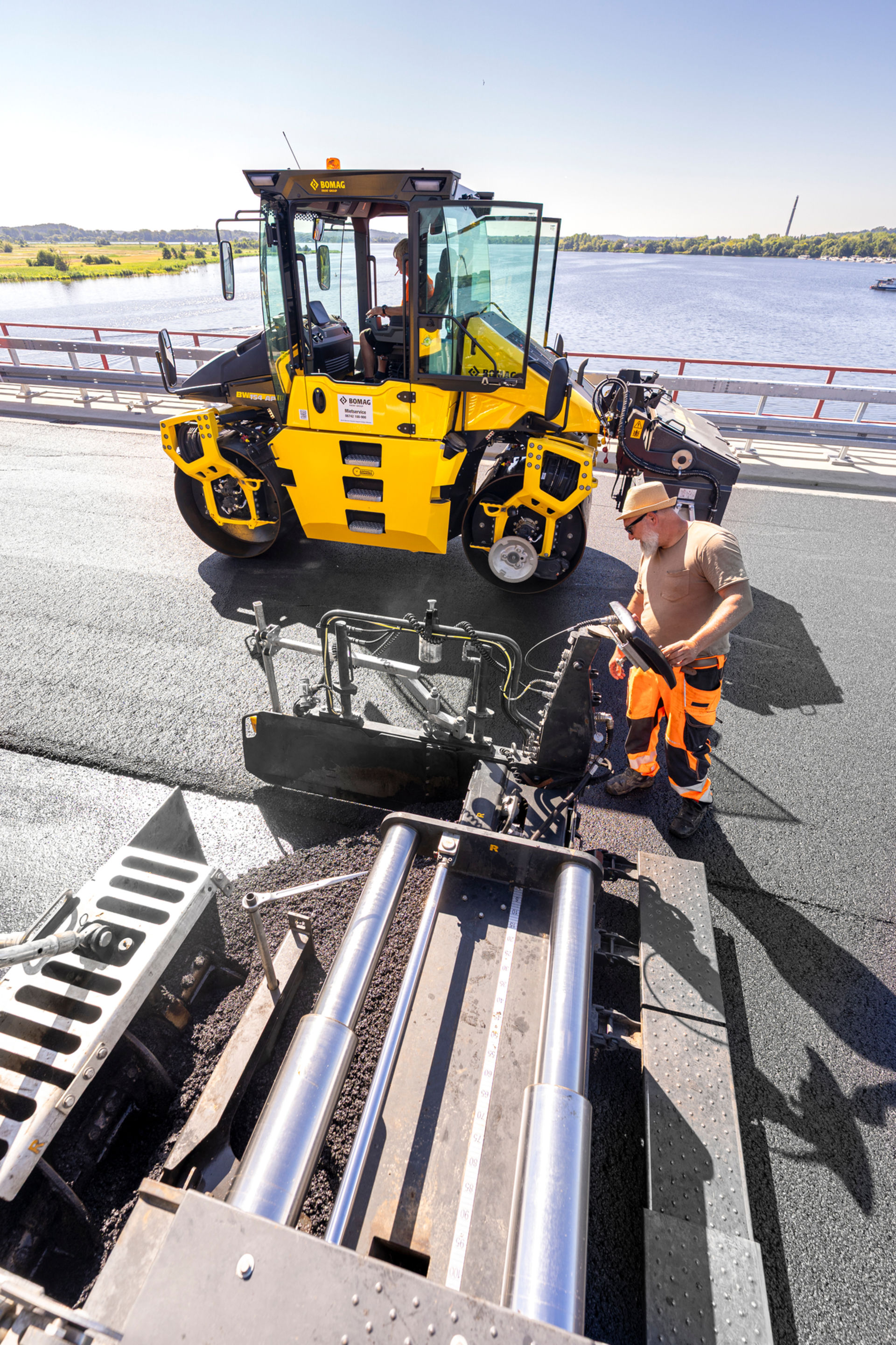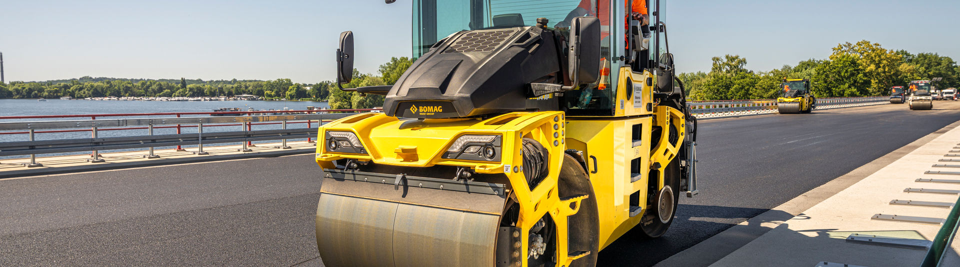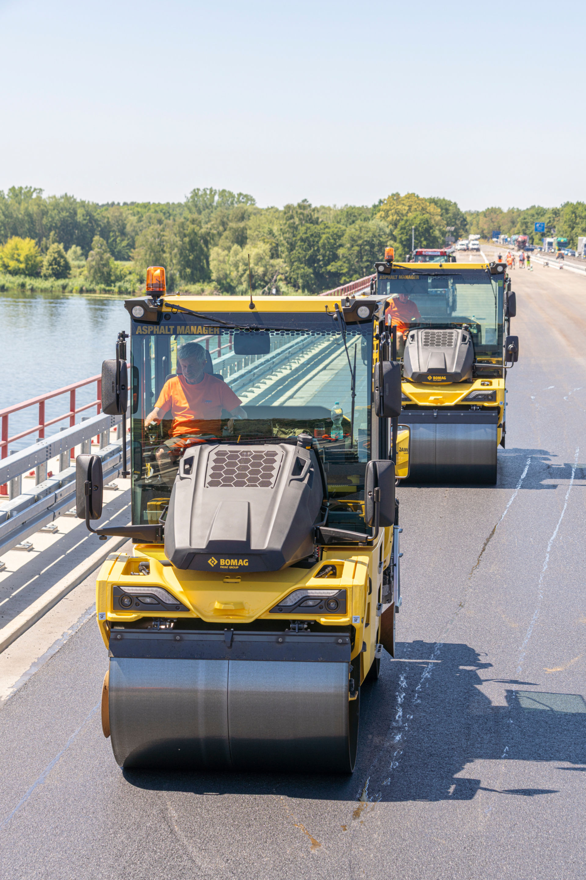 Die hier auf der Havelbrücke eingesetzten schweren schemelgelenkten BOMAG Tandemwalzen tragen als Zusatz die Buchstabenkombination AM im Produktnamen. Das steht für ASPHALT MANAGER.