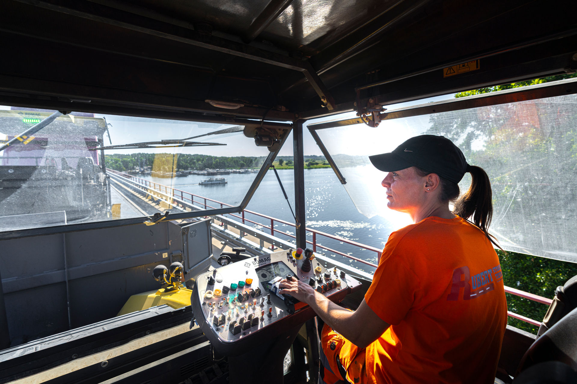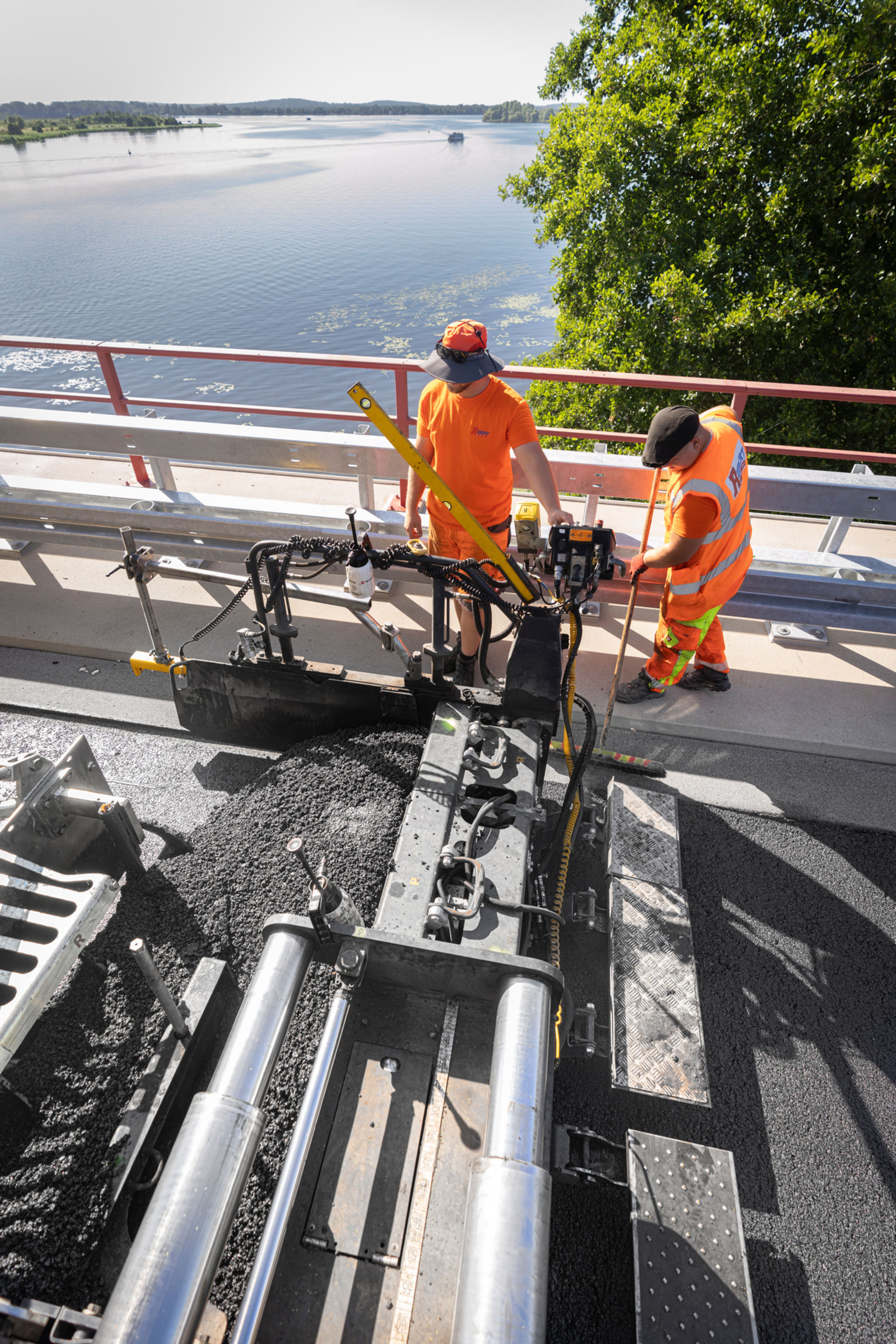 Die Havellandbrücke hat jährlich mehr als 32 Millionen 10-Tonnen-Achsübergänge zu verkraften und das wird bei diesen Zahlen schnell klar: Der Belag der Brücke muss verdammt viel leisten – er muss nicht nur die Belastungen des Verkehrs, insbesondere des Schwerlastverkehrs aufnehmen, sondern diese Verkehrsbelastung auch an das Tragwerk weitergeben, gleichzeitig jede Bewegung der schwingenden Stahlbrücke mitmachen, über das Jahr Kälte und – wie heute – Hitze aushalten, dabei immer auch eben und griffig bleiben.