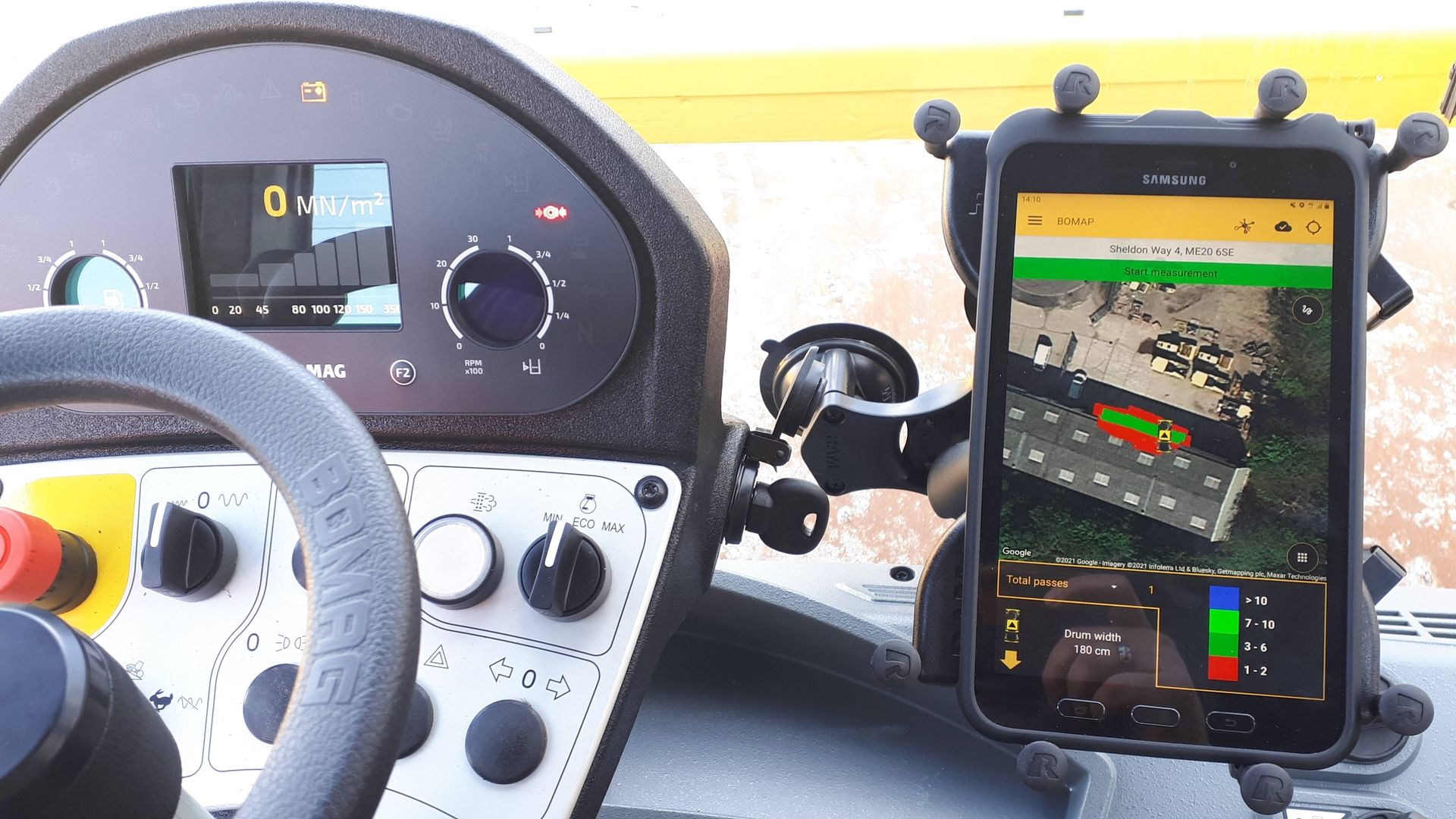 Um schnell optimale Verdichtungsergebnisse zu erzielen und gleichzeitig im Projekt Kosten zu sparen, wurden die Walzenzüge von Lynch mit einem Tablet ausgerüstet. Auf diesem Tablet wurde die BOMAP App installiert. Die App zeigt die Überfahrten in Echtzeit an und zeichnet eine Live-Verdichtungskarte der Baustelle. Der Verdichtungsfortschritt wird durch ein Farbschema eindeutig visualisiert. Die Applikation funktioniert gänzlich ohne Spezialhardware und ist herstellerunabhängig einsetzbar.