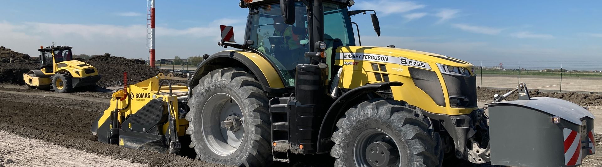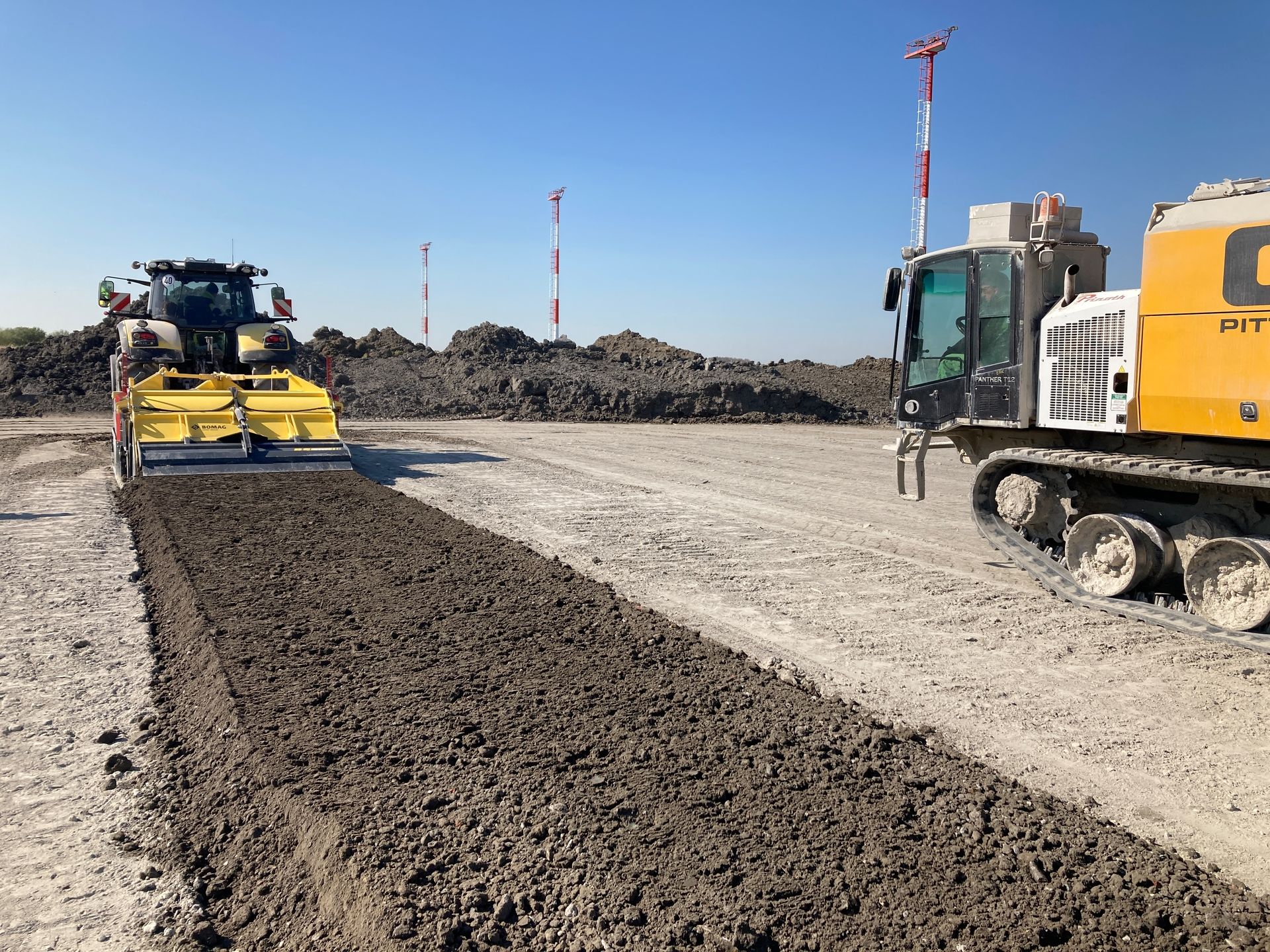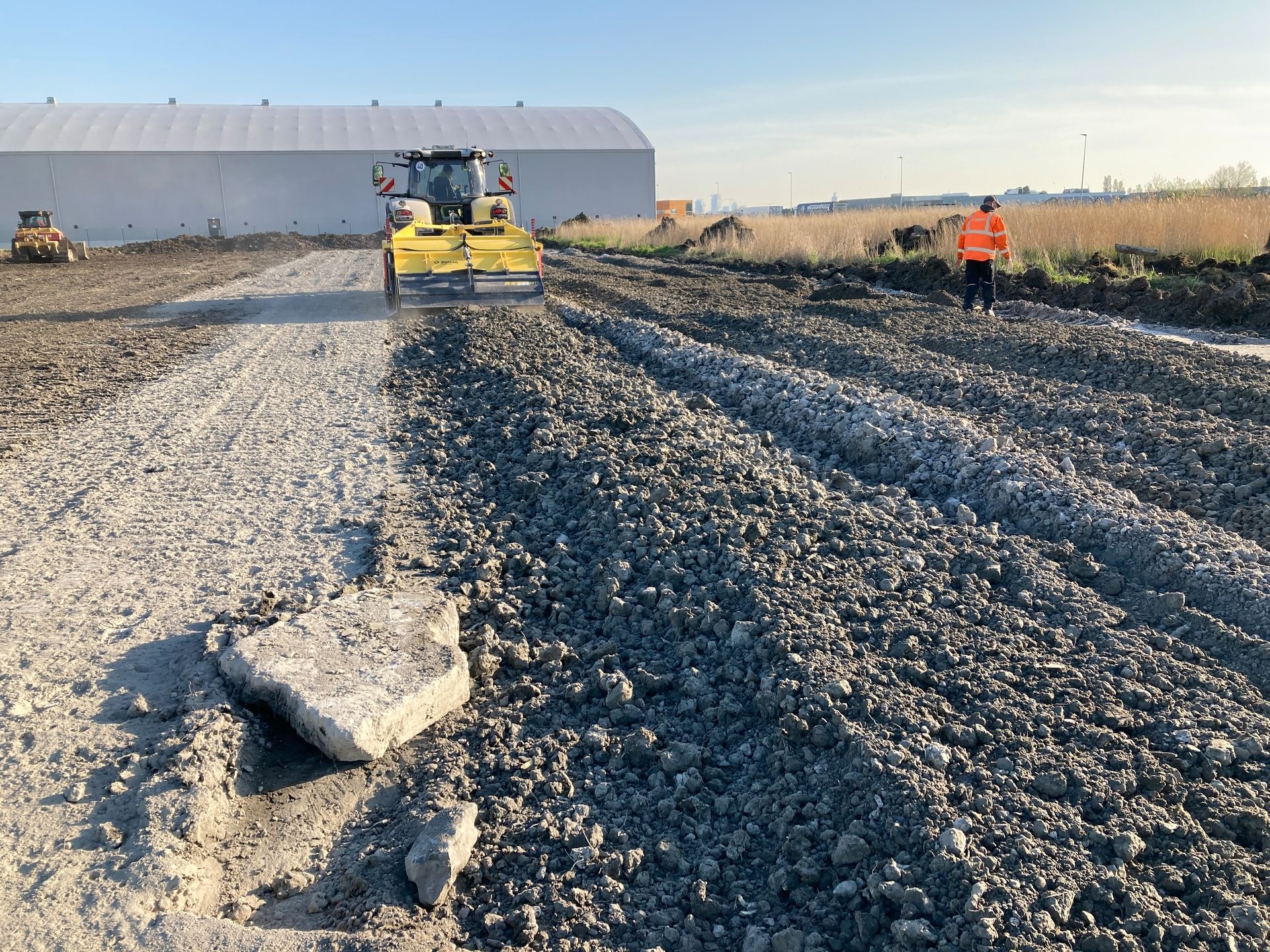 Im Industriegebiet von Ostende wurde das Bindemittel zunächst mit einem Streuer aufgestreut und dann mit der Kombination aus 350 PS starkem Traktor und angekoppelter BOMAG Anhängefräse eingemischt. Pro Quadratmeter und bei einer Mischtiefe von 50 cm mussten durchschnittlich 18 kg Kalk eingebracht werden – insgesamt also fast 72 Tonnen.