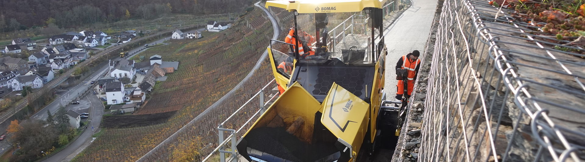 Zum zweiten Mal ist der neue BOMAG City-Fertiger heute für das Team der Tiefbau Velten GmbH im Einsatz. Hoch oben über der Ahrweiler Altstadt müssen in den nächsten Tagen 1.080 m Wirtschaftsweg erneuert werden. Die Hänge weisen bis zu 50 Steigungsprozent auf - seit vielen Jahrhunderten wird hier Wein angebaut.