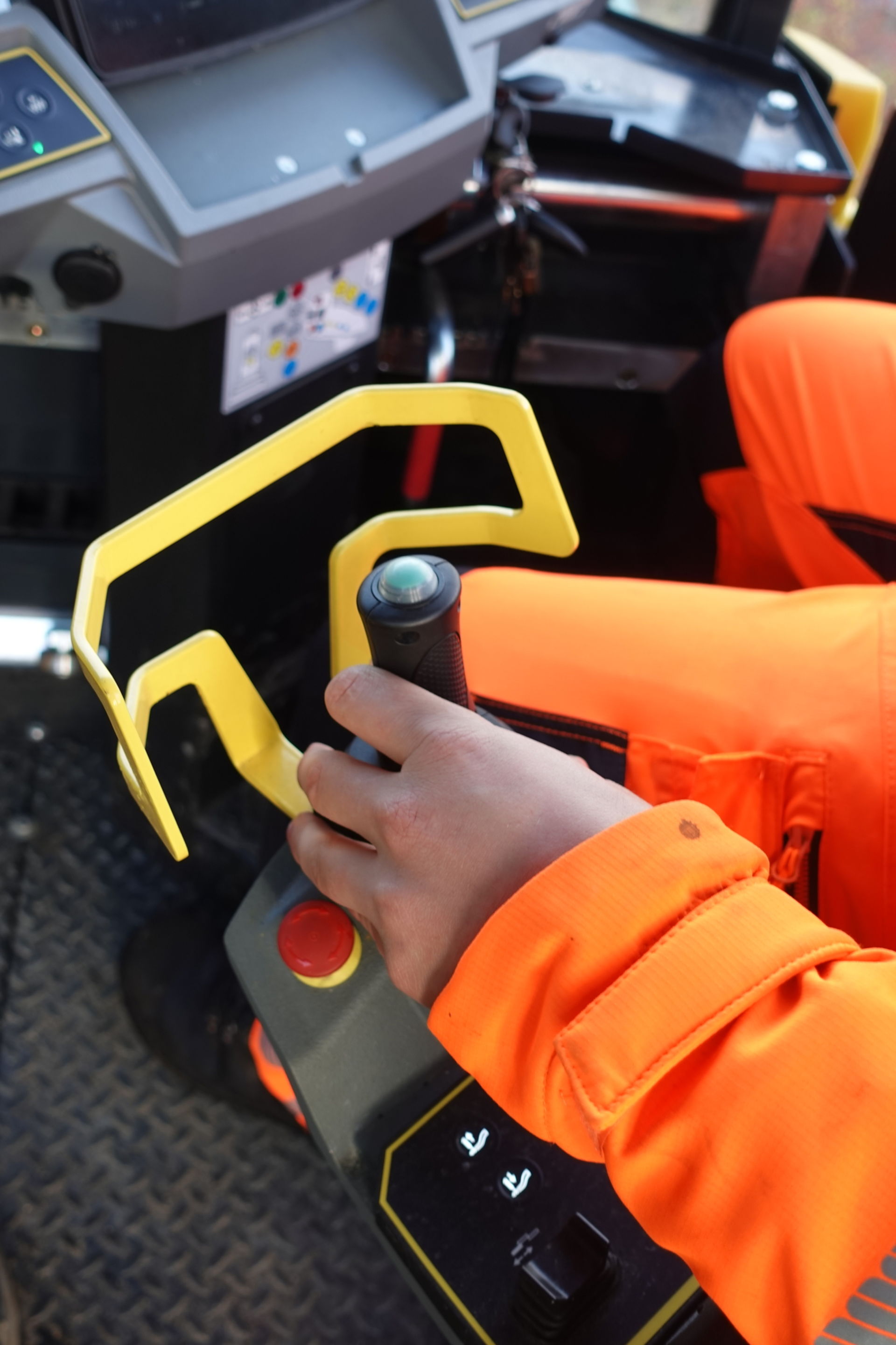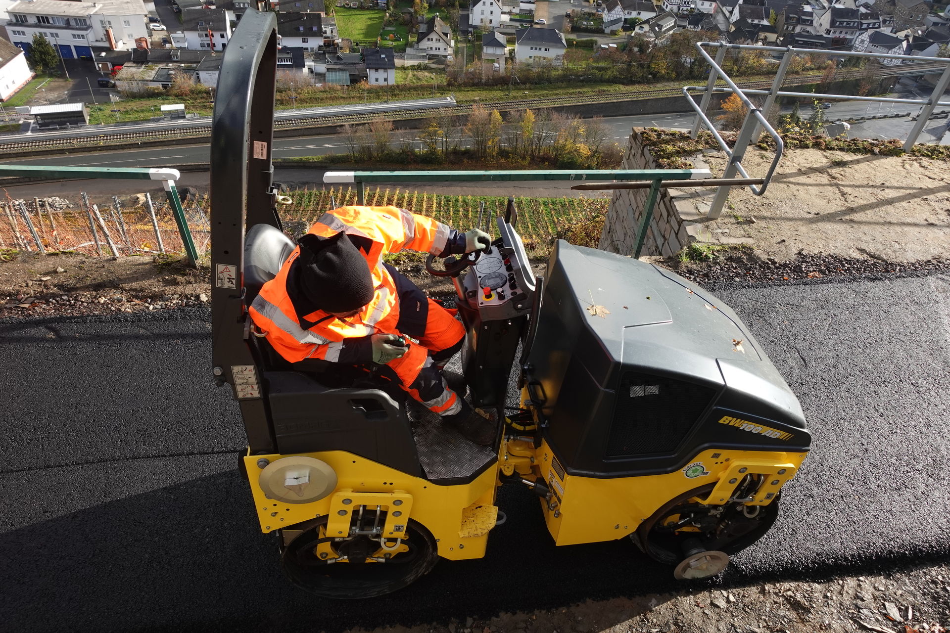 Manuels Arbeitsplatz ist besonders ergonomisch gestaltet: Der drehbare Fahrersitz und die Bedienelemente bilden hier eine Einheit. Der Joystick ist auf der Armlehne positioniert, der Sitz kann seitlich komplett ausgeschwenkt werden. In der ausgeschwenkten Position und bei wechselhaftem Wetter – so wie jetzt im November – bietet die durchdachte Kabinenkonstruktion mit hydraulisch ausklappbarem Seitendach den perfekten Schutz. Trotz zwischenzeitlich doch noch einmal einsetzendem Nieselregen: Manuel sitzt an diesem Morgen im Trockenen und hat trotzdem immer beste Sicht: auf die Maschinenkante, in den Kübel, auf die Schnecke, die Bohle, auf den gesamten Materialfluss – und natürlich runter ins Tal, wo eine weitere Baustelle die Szenerie prägt: Der nahezu abgeschlossene Wiederaufbau der durch die verheerende Flut am 14. Juli 2021 fast vollständig zerstörten Ahrtalbahn.