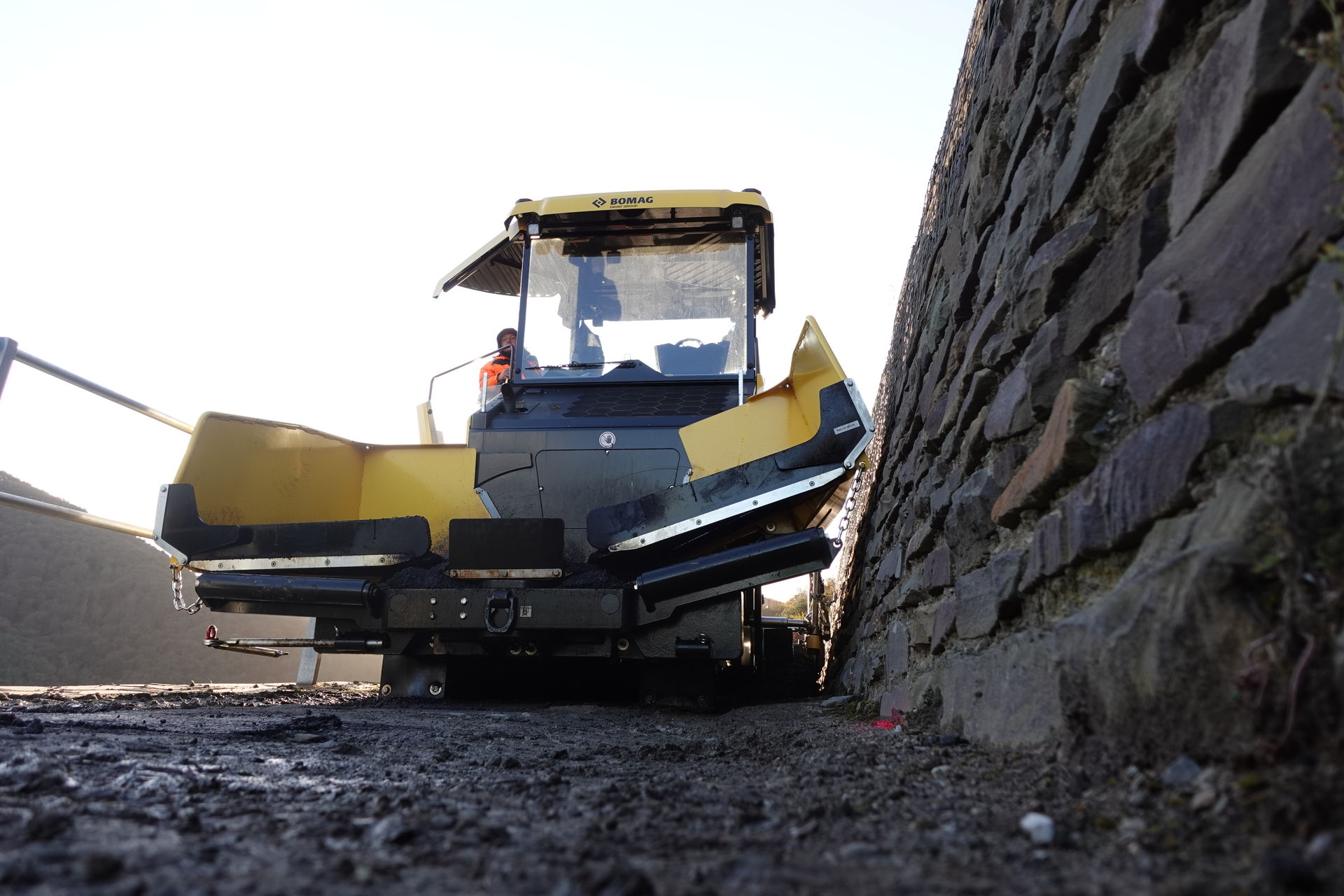 Fingerspitzengefühl ist gefragt. An manchen Stellen beträgt der Abstand zwischen Abgrund und Stützmauer nur 2,70 m. Hier passt der BF 350 C-5 gerade so durch. Aber dank perfekt ansprechender Joystick-Steuerung gelingt das Manövrieren der Maschine millimetergenau.