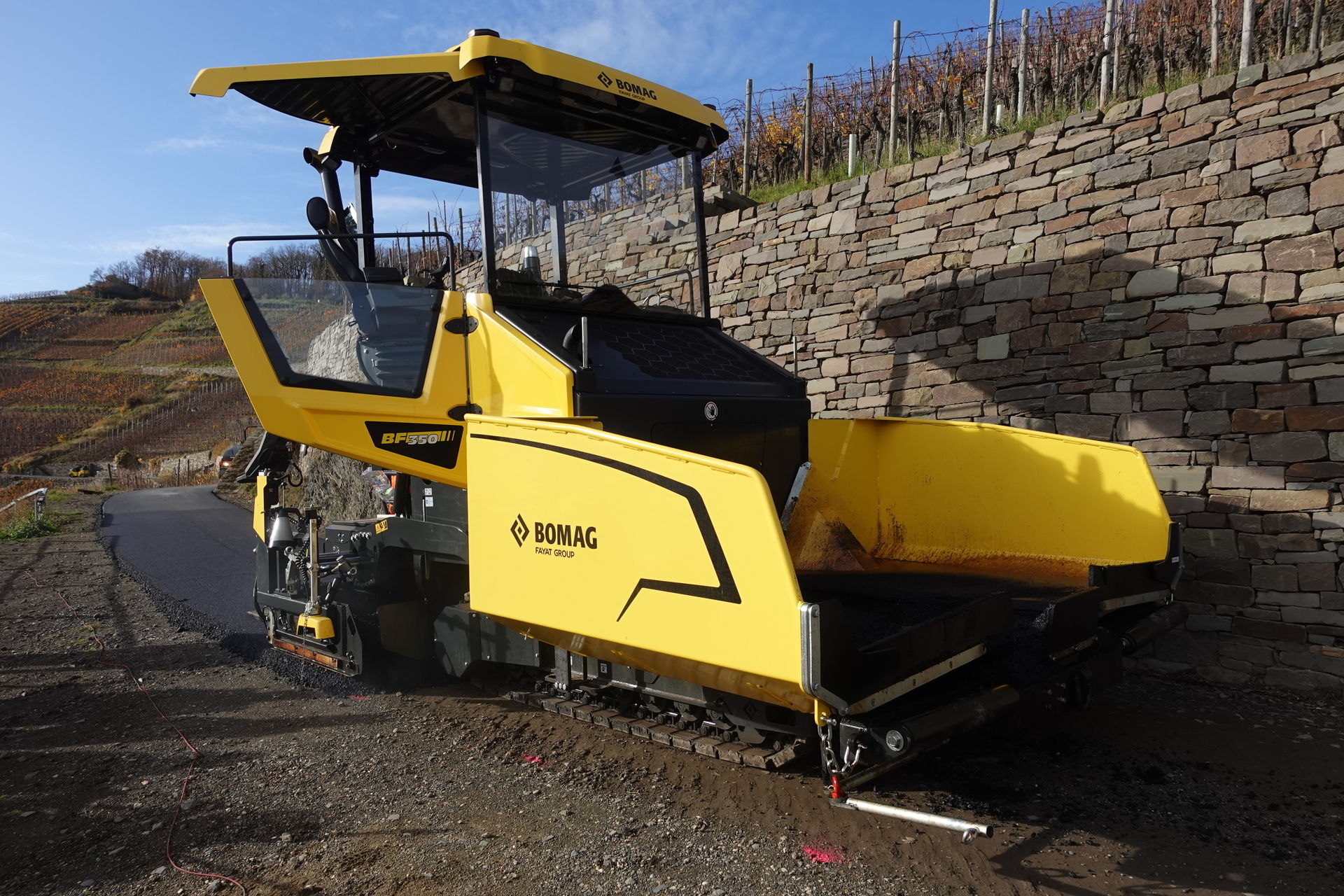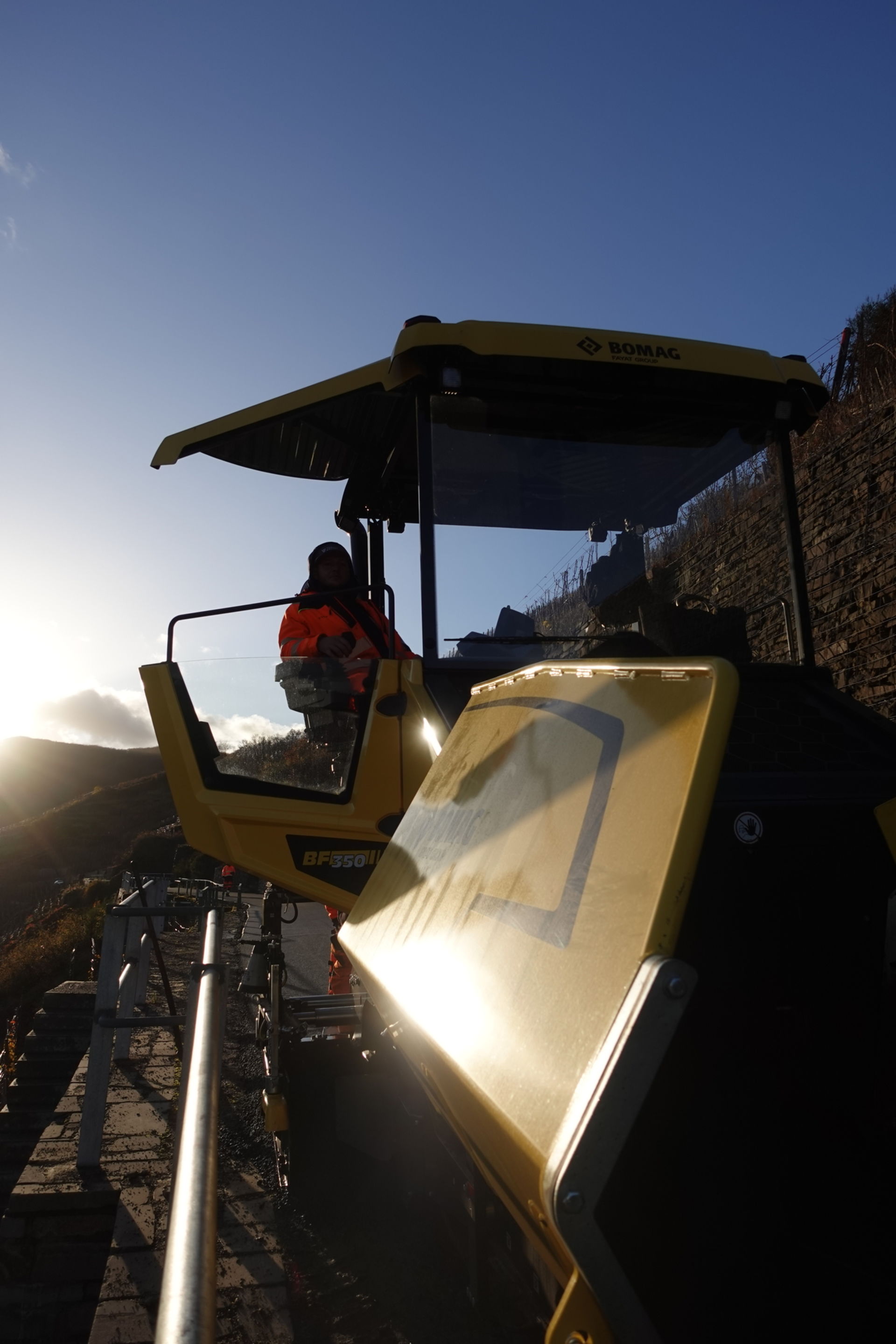 Zudem ist der BF 350 C-5 mit einem starken und gleichzeitig besonders wirtschaftlichen Motor ausgestattet. Der bietet in jeder Arbeitssituation genügend Reserven. Das hat Polier Florian Densing schon bei der Auffahrt hoch in die Weinberghänge gemerkt. Während des Einbaus läuft der Motor dann immer im optimalen Drehzahlbereich. Ein Faktor, der den Spritverbrauch senkt und gleichzeitig die Lärmemissionen niedrig hält. Unten im Tal hört man nicht, dass hier oben eingebaut wird.
