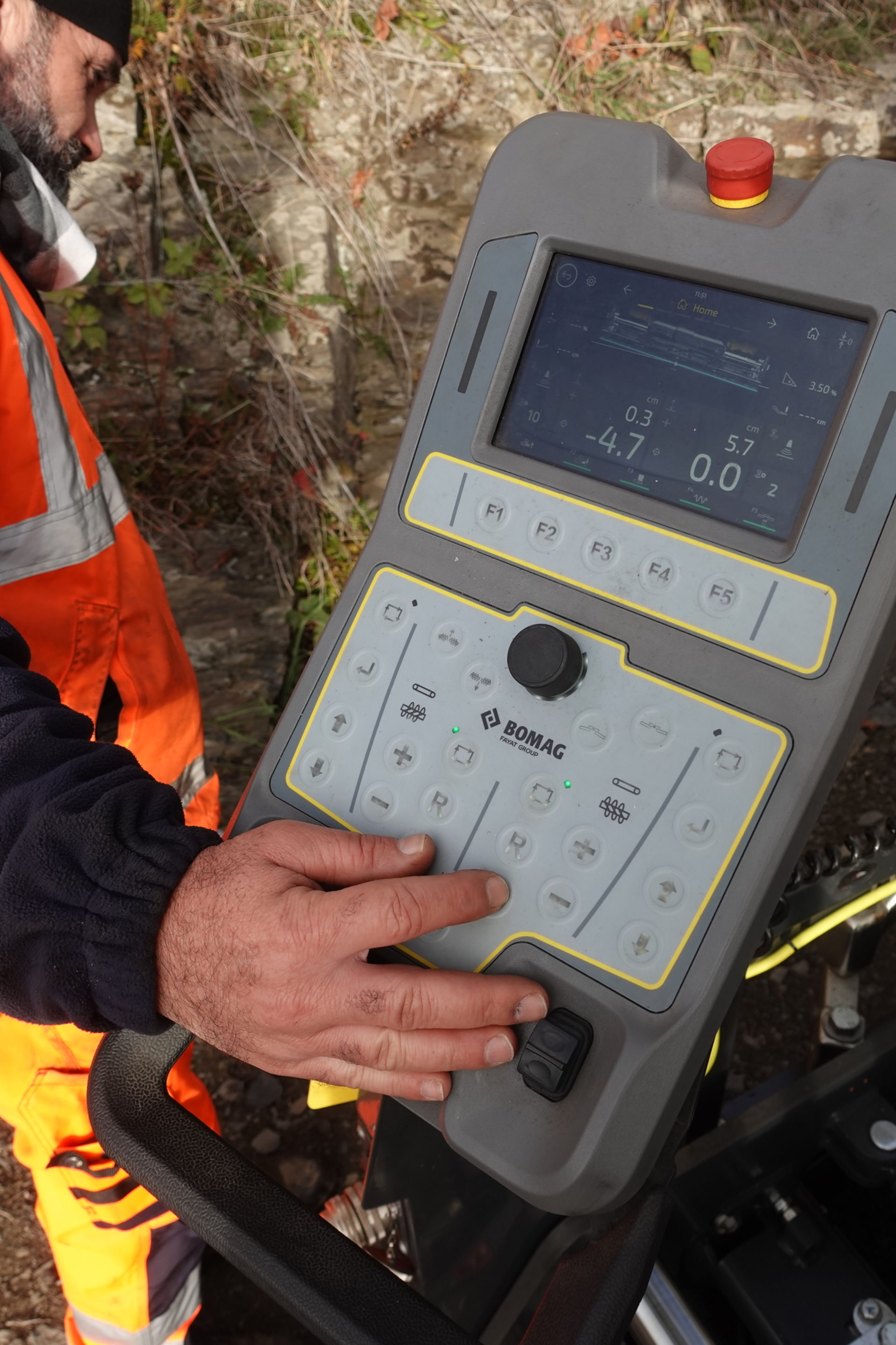 Manuel ist heute als Fahrer eingeteilt. Er hat bereits Erfahrung auf dem großen BOMAG Fertiger-Modell BF 700 sammeln können. Auch die Bedienung des brandneuen BF 350 C-5 ist für ihn kein Problem, denn der neue BOMAG City Fertiger kann mit den gleichen Assistenzsysteme punkten, die Manuel von den großen Brüdern des BF 350 C-5 kennt. Sie ermöglichen einen besonders effizienten Einbau und ein Maximum an Qualität. Bohlenbreitenmessung, Dachprofil, Querneigung, Schneckenposition, Zugarmhöhe – alle wichtigen Einbau-Parameter sind im Digital-Display leicht ablesbar. Das durchdachte Bedienkonzept erleichtert Manuel die Arbeit enorm.