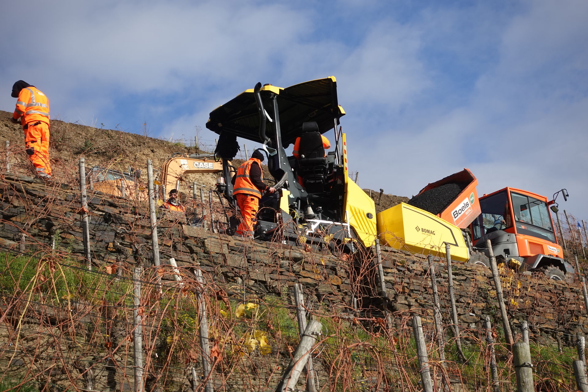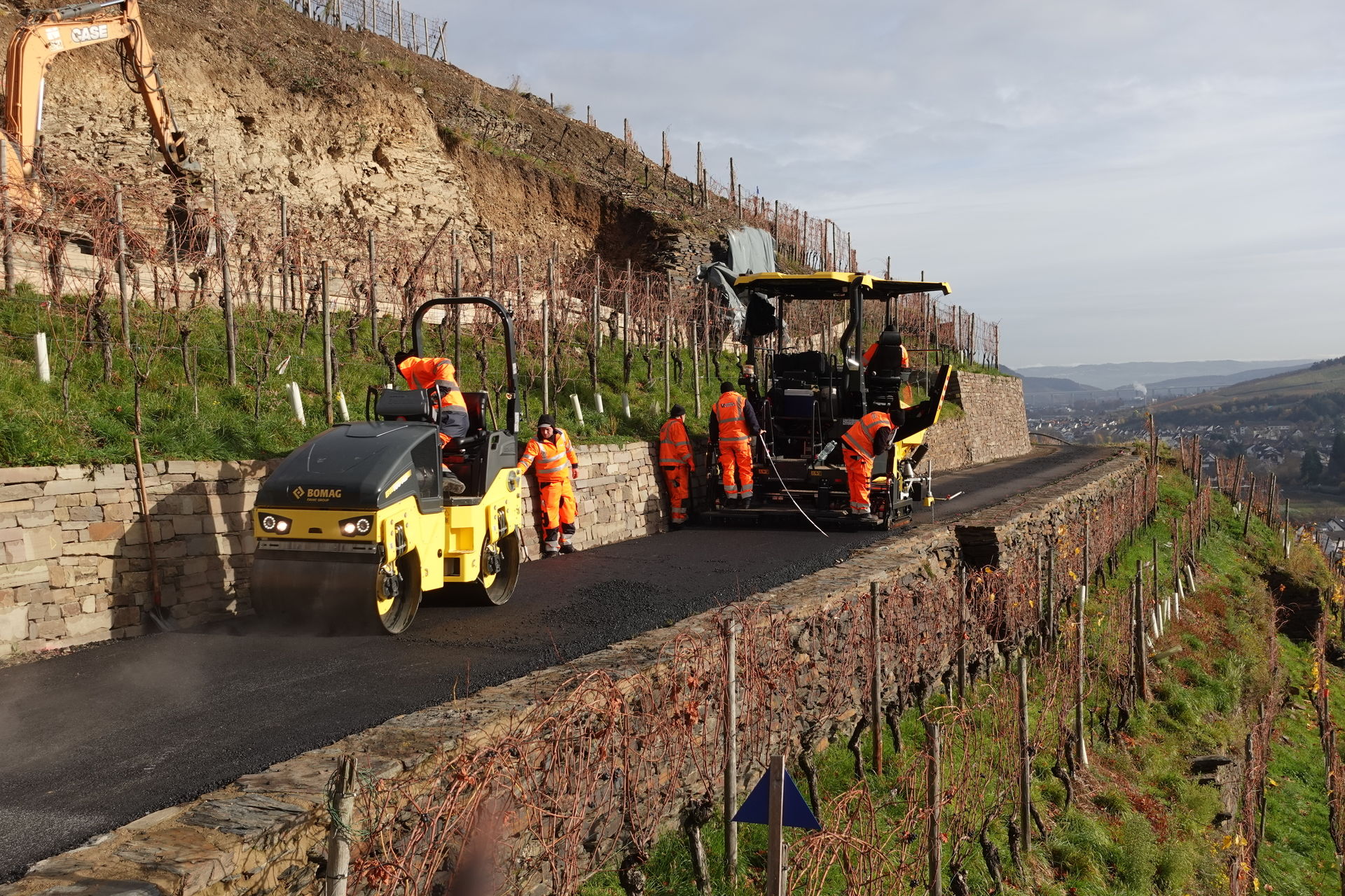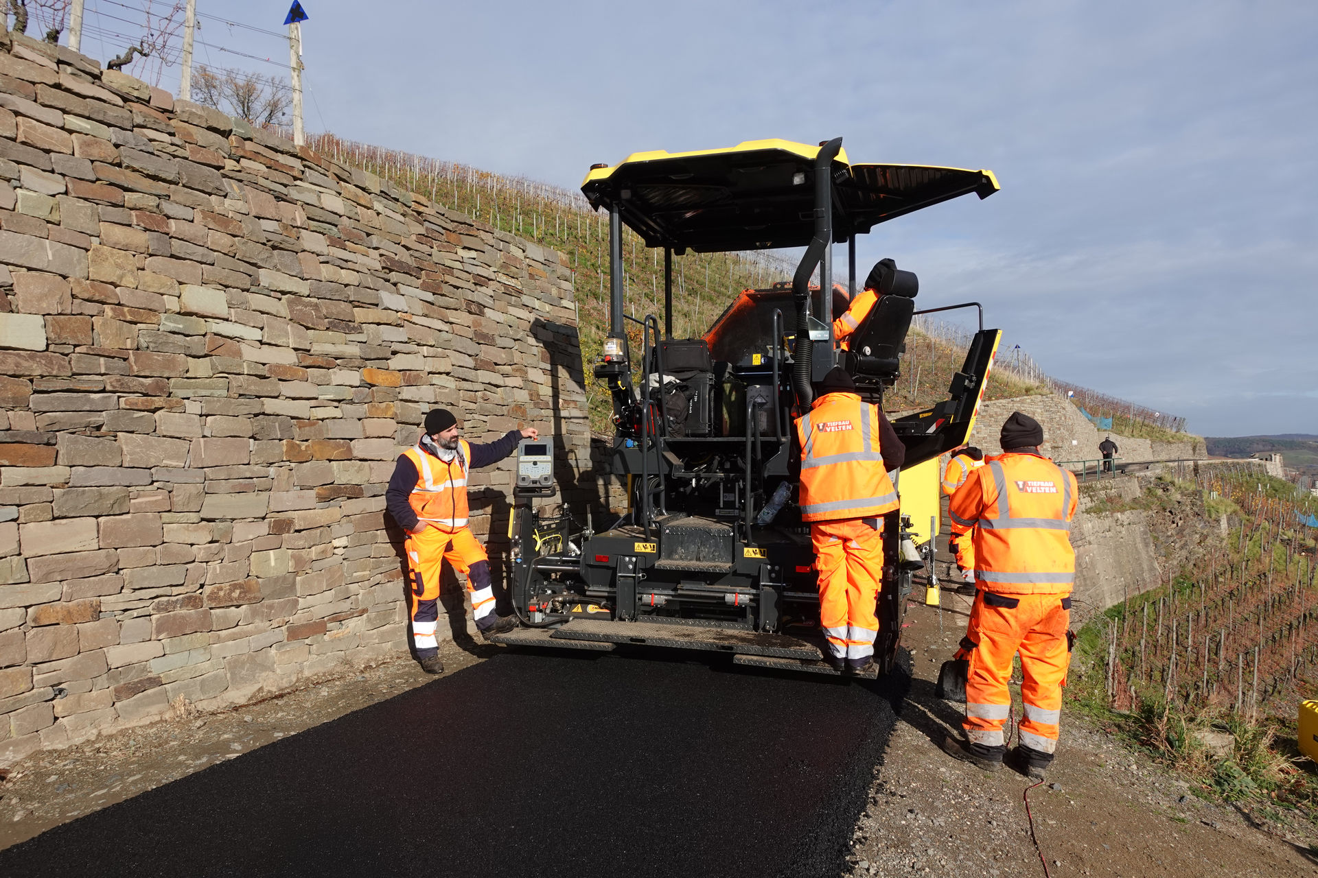 Bereits am Vortag hat Polier Florian Densing den Fertiger über die Serpentinen des Rotweinwanderweges hoch zum Einsatzort gefahren. Er und sein neu zusammengestelltes, hochmotiviertes Asphalt-Team sind sonst auf Baustellen im eine halbe Autostunde entfernten Ballungsgebiet Bonn/Rhein-Sieg im Einsatz. Die Maßnahme in den Weinbergen ist für sie eine willkommene Abwechslung und eine logistische Herausforderung zugleich.