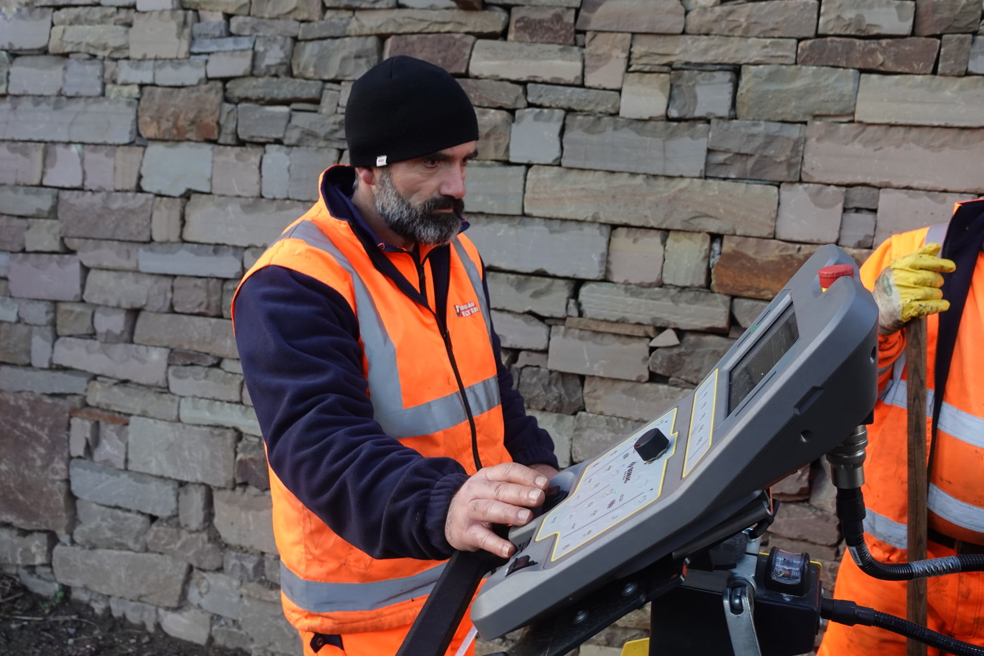 Das Team kommt voran. Der BF 350 C- 5 und der Einbau laufen problemlos. Hinter dem Fertiger verdichten zwei leichte BOMAG Tandemwalzen. Die BW 100 AD-5 wird von Ferhad Habash pilotiert. Er lebt seit vielen Jahren in Deutschland, und ist, so erzählt er nicht ohne Stolz, schon in seiner alten Heimat Syrien BOMAG Walze gefahren. Seine Maschine, eine Walze der 5. Generation, ist mit dem ECONOMIZER ausgestattet. Der ECONOMIZER identifiziert bereits optimal verdichtete Bereiche, aber auch die Schwachstellen im Untergrund. Der Walzenfahrer weiß so genau, was wann wo noch zu tun ist. Die Gefahr einer Überverdichtung kann so vermieden und die Anzahl der Überfahrten um bis zu 25 % reduziert werden.