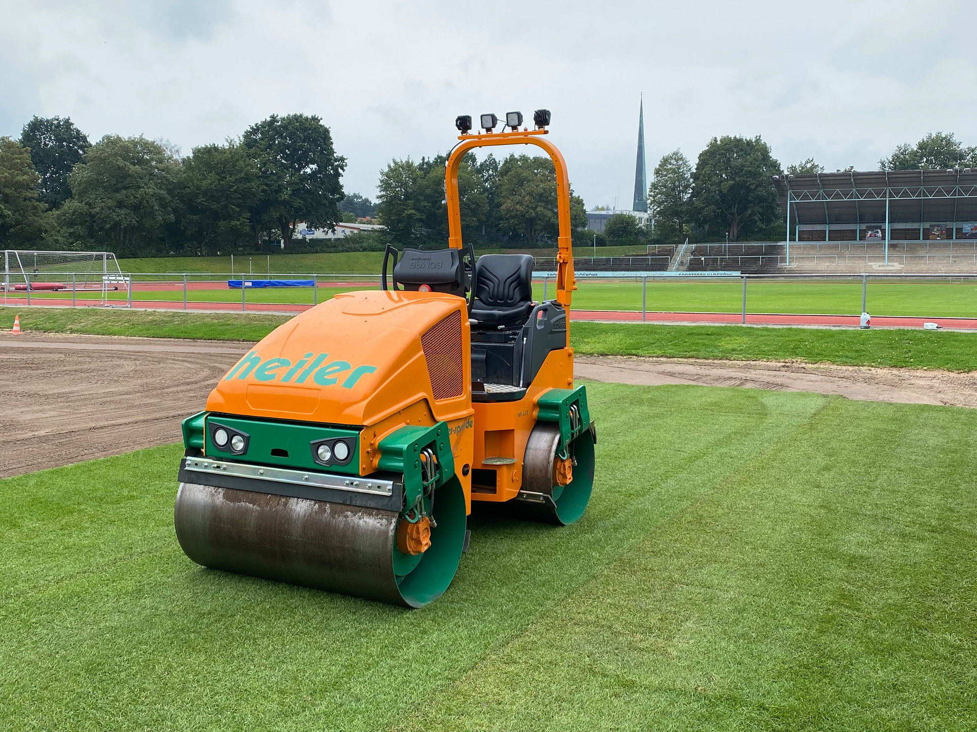 heiler setzt auf eine Sondermaschine von BOMAG zum optimalen Andrücken der 200 cm breiten Grassoden. Bei der Verlegung von Rollrasen im Sportpark Illoshöhe kam die Maschine das erste Mal erfolgreich zum Einsatz. Die städtischen Sportflächen werden als Trainingsplätze vom Lizenzbereich des VfL Osnabrück genutzt. Um eine statische Linienlast von < 10 kg/cm zu erreichen, wurde die BOMAG Tandem-Vibrationswalze BW 120 AD-5 kundenspezifisch umgebaut. Die Bandage wurde dazu von 1200 mm auf 1350 mm vergrößert und die Mantelstärke von 13 mm auf 10 mm reduziert. Statt 11,3 kg/cm erreicht die gewichtsreduzierte Tandemwalze (2,5 t statt 2,7 t) nun die erforderlich statische Linienlast < 10 kg/cm.