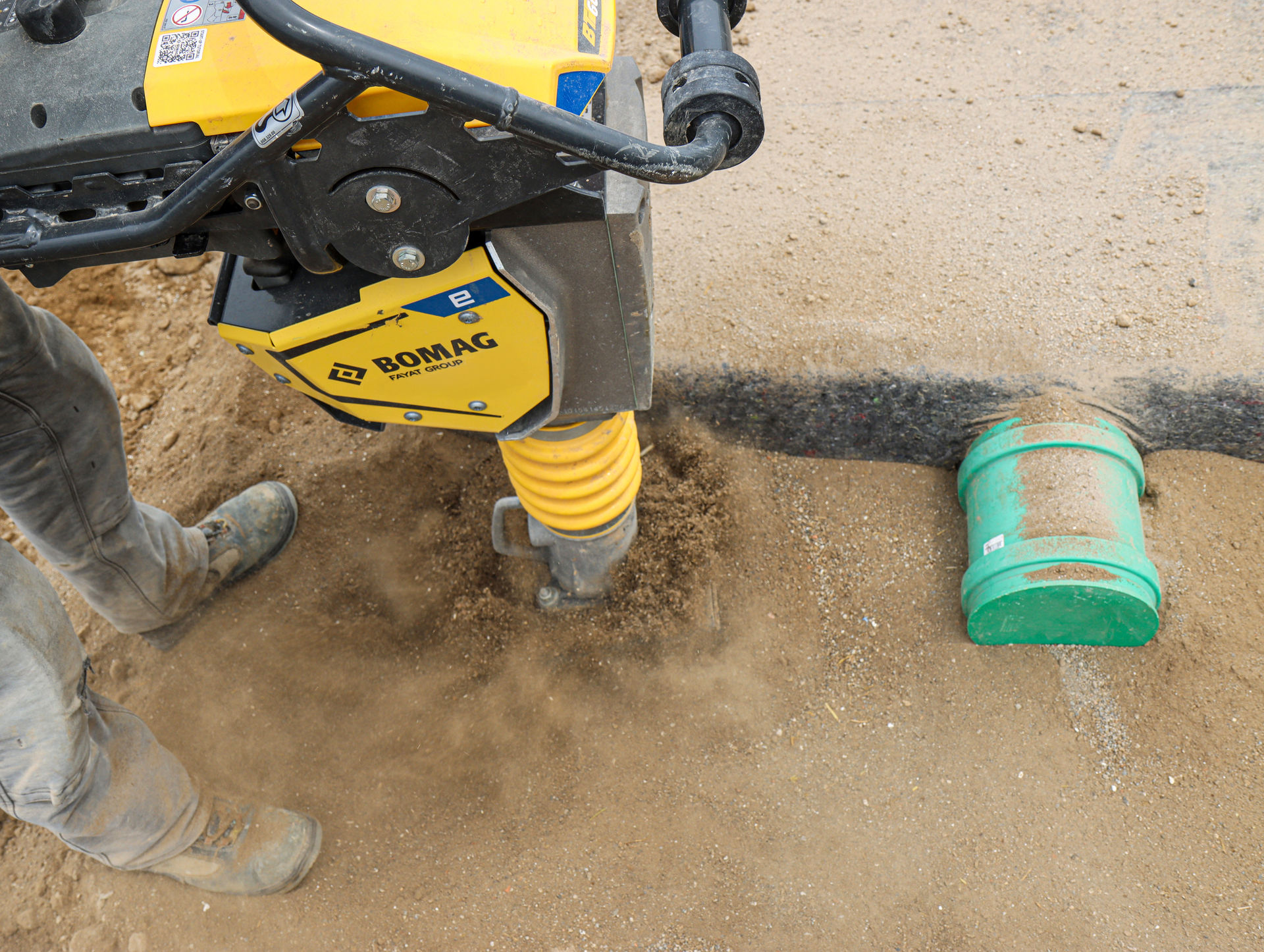 Das Team von Weimer vertraut seit Langem auf Verdichtungstechnik aus Boppard. Auch schwereres BOMAG Gerät ist auf dem ehemaligem Kasernenareal im Einsatz: ein kleiner BOMAG Walzenzug, der BW 124 PDH-5 und die neue BOMAG Grabenwalze BMP 8500. Sie kommen auf größeren Flächen zum Einsatz – die ferngesteuerte Grabenwalze immer dann, wenn es besonders herausfordernd, eng oder gefährlich wird.