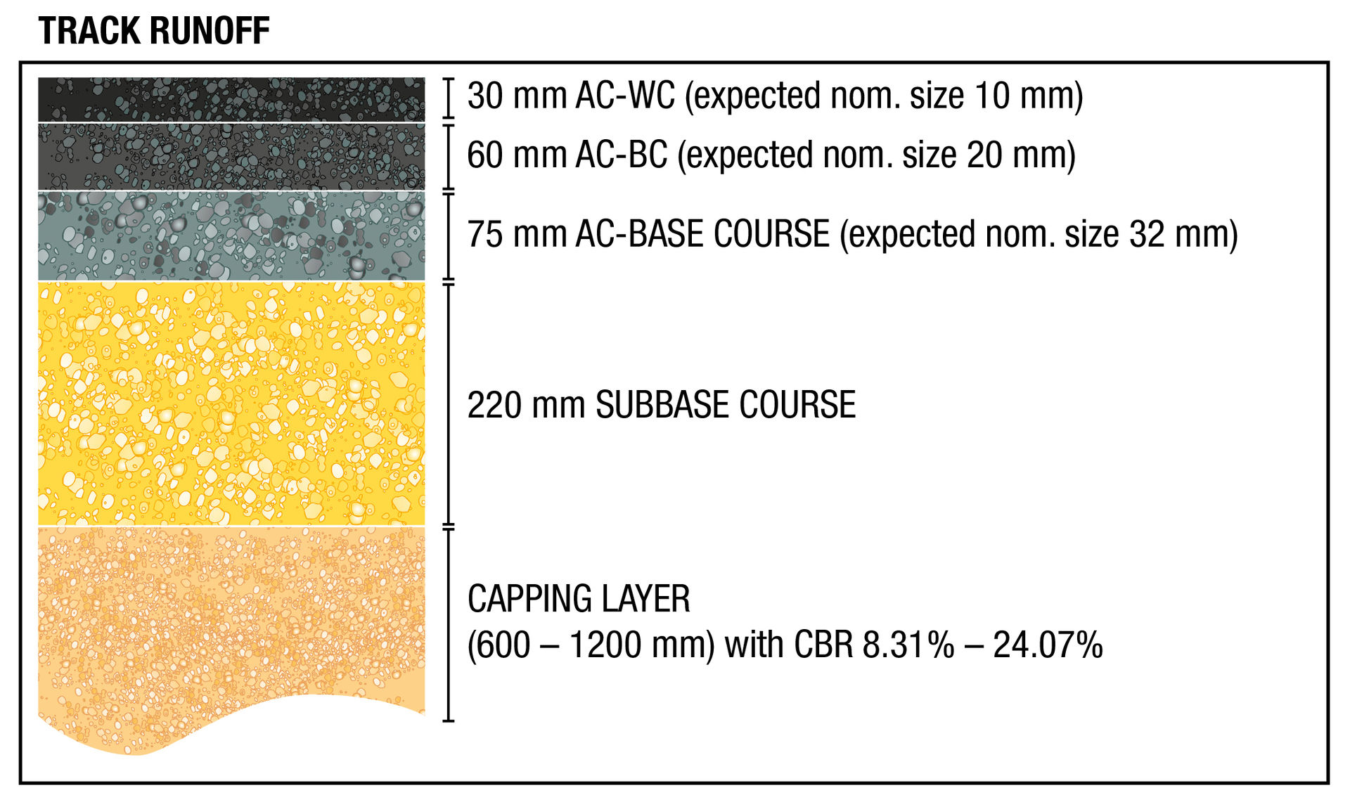 Die Deckschicht besteht aus Splittmastixasphalt (SMA Mix) mit einem polymermodifizierten Bitumen. Der Asphalt wurde in fünf Einzel-Abschnitten eingebaut. Die Anzahl der Querfugen konnte somit erheblich reduziert werden. Die Abschnitte waren zudem räumlich genau definiert, um auch den ästhetischen Ansprüchen an das Streckenbild zu genügen. In dieser Phase wurde eine 3-Fertiger-Konfiguration eingesetzt. Nach fünf Tagen war die gesamte Deckschicht fertig. Längsfugen sind dank des Einbauverfahrens „Heiß-an-heiß“ und der 3-Fertiger-Lösung nicht sichtbar.