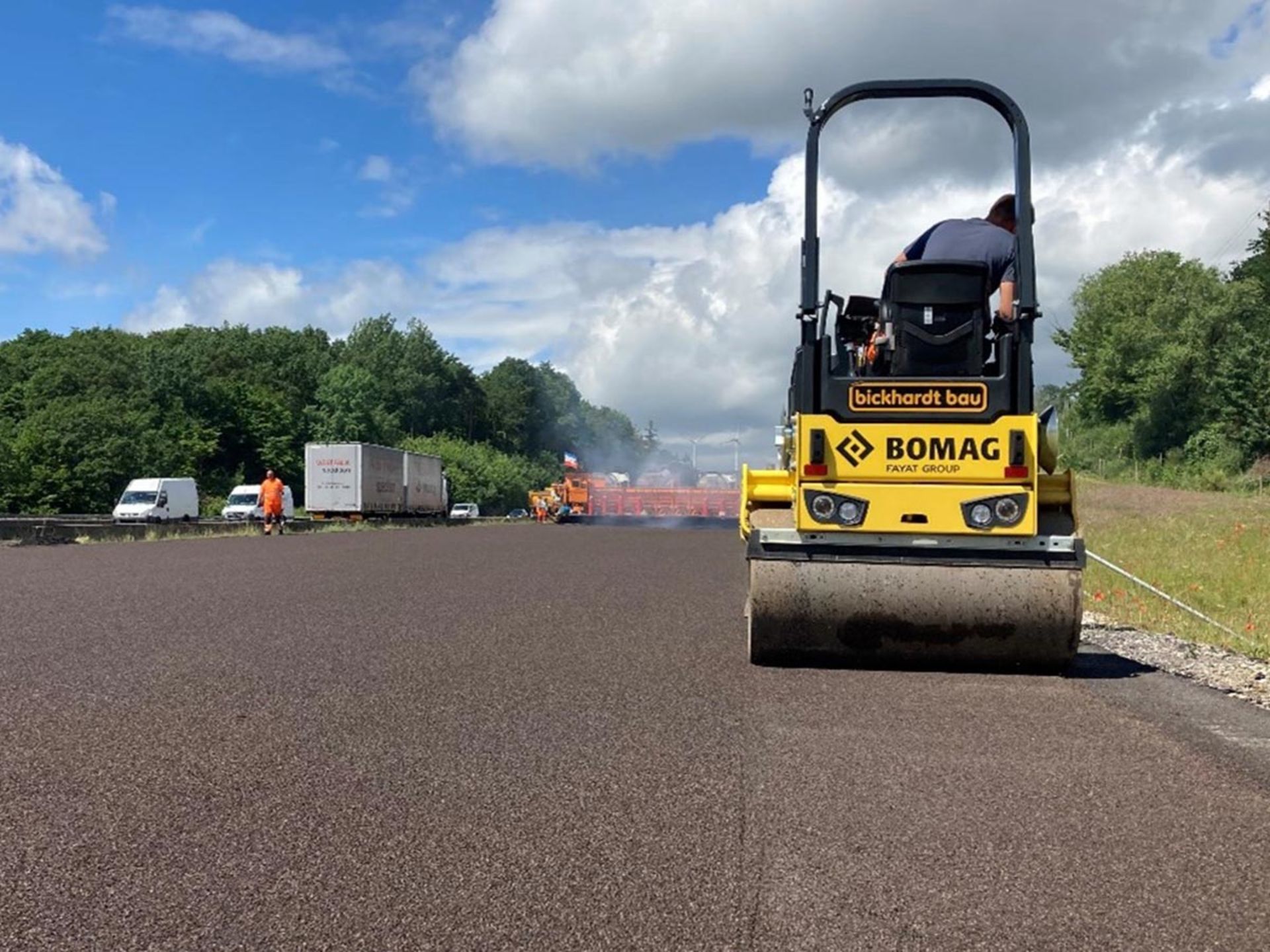 Bei der Anschlussstelle Rheinböllen setzte die Firma Bickhardt Bau AG nun eine BOMAG BW 120 Tandemwalze ein, die auf Kundenwunsch für das Walzen von Split auf Gussasphalt konstruktiv optimiert wurde. Damit konnte das Unternehmen die Flächenleistung um 11 Prozent erhöhen, Arbeitsprozesse weiter optimieren und vor allem die Qualität der Gussasphaltdeckschicht auf ein völlig neues Niveau bringen. Auch bei den Life-Cycle-Kosten für Gussasphalt macht sich die extrem sanfte Walzen-Veredelung der Deckschicht signifikant bemerkbar.