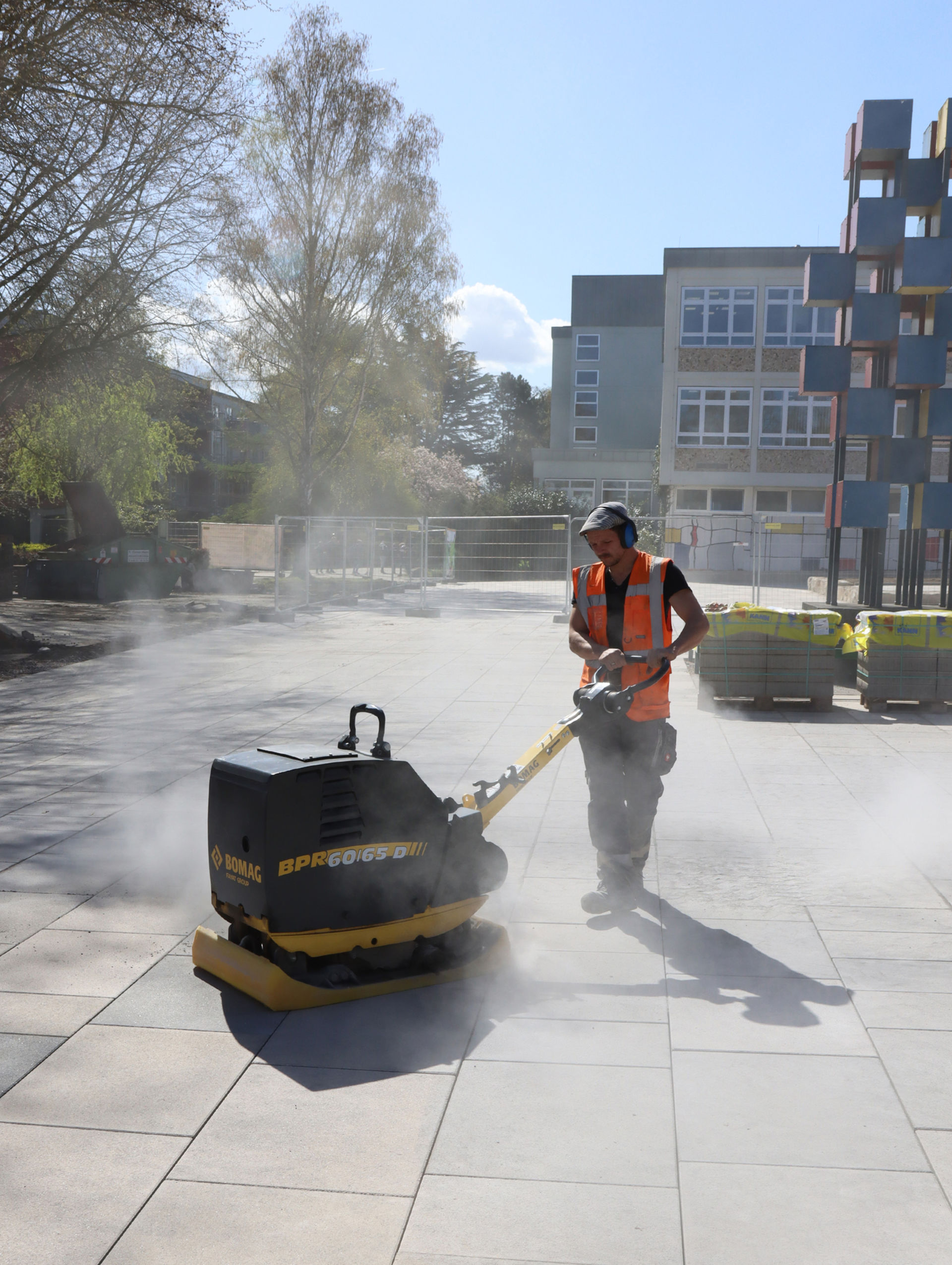Die Männer von HS SCHULZ können die Maschine direkt an Randsteine, Fassaden oder an im Pflaster stehende Säulen und Pfähle heranführen. Sie können ohne Probleme randgenau arbeiten, ohne etwas zu beschädigen. So konnte die BPR 60/65 D STONEGUARD auch in dieser Disziplin punkten, denn auf dem Schulhof des Johannes-Gymnasiums lockern immer wieder Grünflächen, Hochbeete, Spielangebote und Aufenthaltsmöglichkeiten die große Fläche auf.