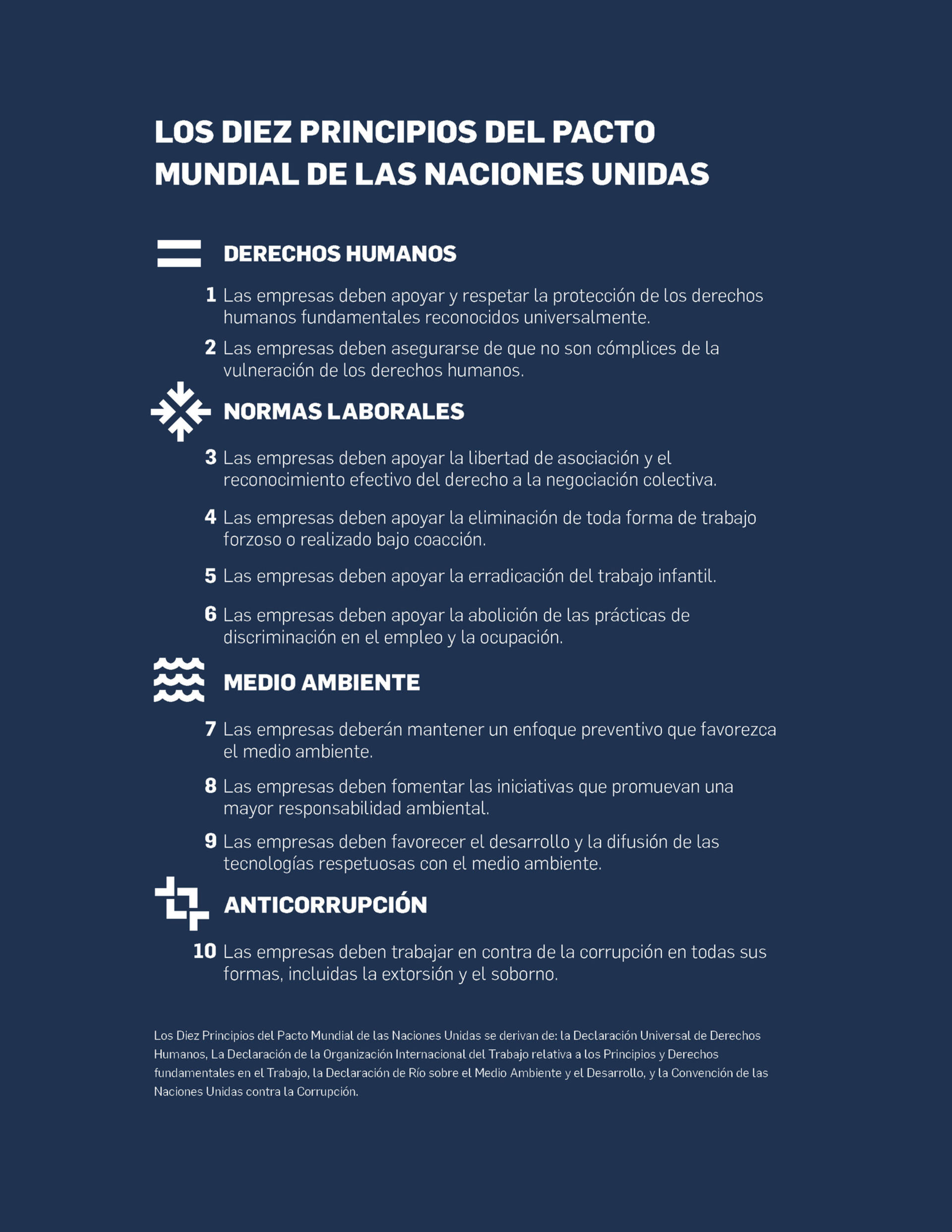 Los Diez Principios del Pacto Mundial de las Naciones Unidas derivan de la Declaración Universal de Derechos Humanos, la Declaración de la Organización Internacional del Trabajo relativa a los Principios y Derechos Fundamentales en el Trabajo, la Declaración de Río sobre el Medio Ambiente y el Desarrollo y la Convención de las Naciones Unidas contra la Corrupción.