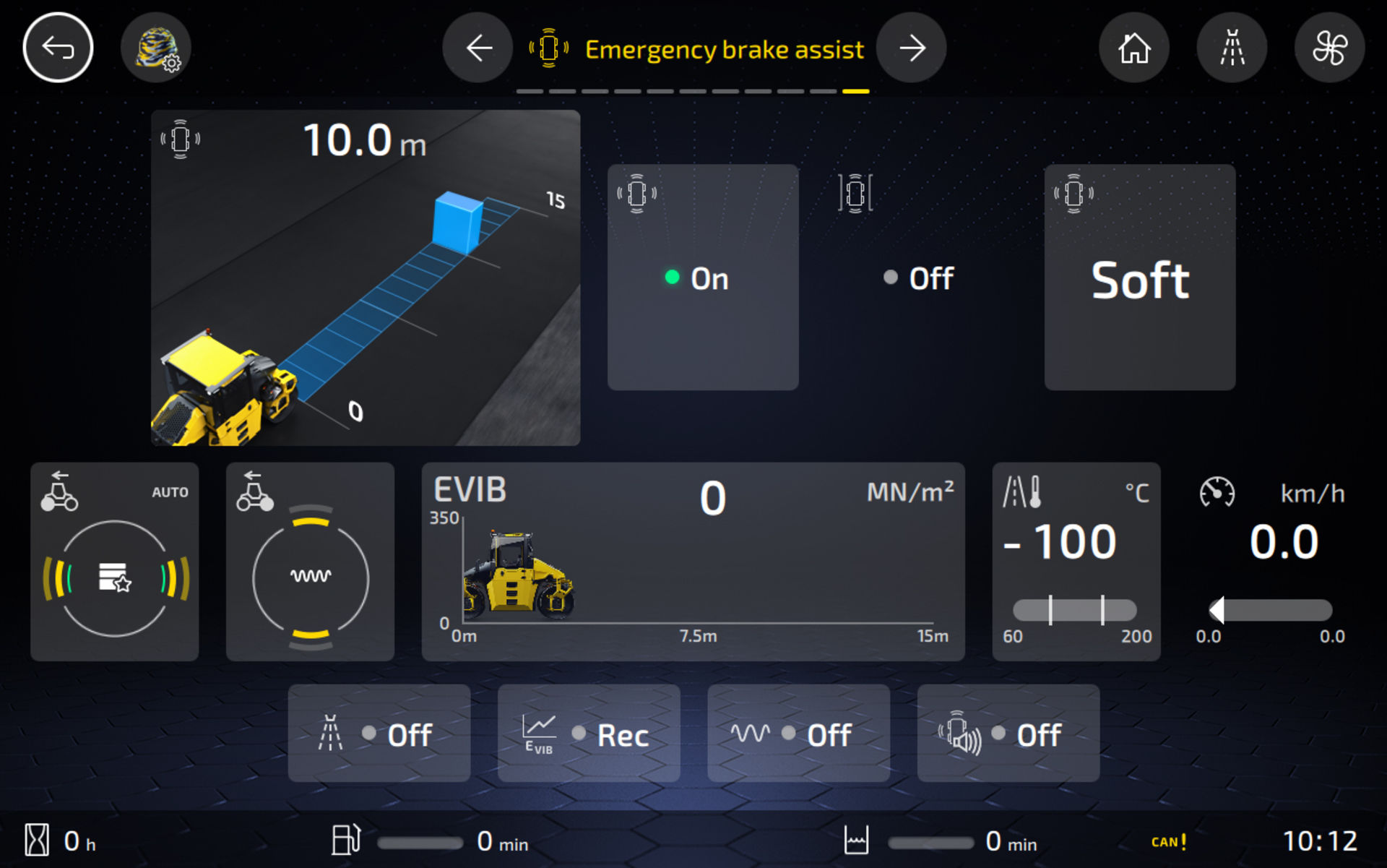 Il sistema di assistenza viene visualizzato e gestito sul touchscreen installato di serie nei rulli tandem BOMAG con sterzo a ralla. Qui il sistema Emergency Brake Assist può essere personalizzato in base al comportamento di guida dell’operatore del rullo e alla situazione nel cantiere. Gli operatori possono sempre regolare la frenata su tre livelli di intensità.