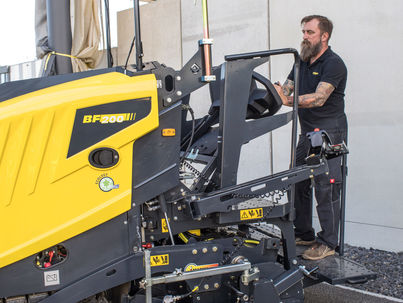 Dans sa position haute, la plate-forme réglable en hauteur du BF 200 C-2 vous assure une vue intégrale sur la trémie, sur la zone de travail et sur l’environnement autour du finisseur. Plus d’angles morts – le chauffeur peut travailler en toute sécurité et communiquer parfaitement avec son équipe.